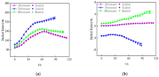 Figure 9 depicts the time-domain diagram illustrating changes in the pressure experienced by the left and right sides of the rocker arm concerning the distance between the rocker arm and the tail of the jacket during the launching of the model jacket under regular waves (wave height 1 m, period 2 s), wind speed 11.4 knots, and flow speed 1 m/s.