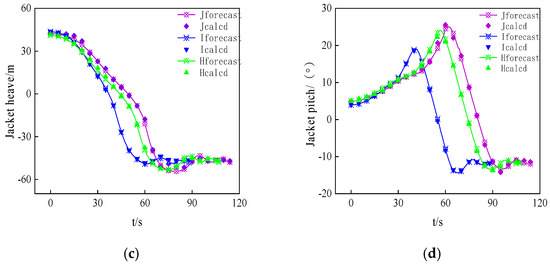 Comparison between predicted values and calculated values of jacket attitude: (a) jacket surge, (b) jacket sway, (c) jacket heave, and (d) jacket pitch.