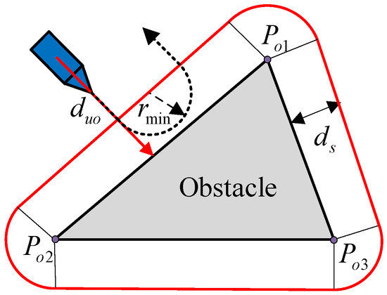 The security constraint is used to avoid obstacles that appear on the route and maintain a safe distance from them. The obstacle is represented by a polygon consisting of multiple endpoints . It is necessary to ensure that the USV adjusts its heading to avoid obstacles within a safe distance, so the distance from the unmanned ship to the obstacle is larger than the safe distance from the obstacle and larger than the minimum turning radius , as shown in (4) and Figure 2.