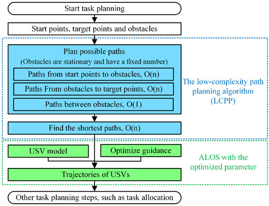 The remainder of this paper is organized as follows. Section 2 formulates and analyzes the path planning for multiple USVs in task planning. Section 3 presents the low-complexity path planning algorithm (LCPP) and ALOS with the optimized parameter. The results of simulation and comparison are presented in Section 4, followed by conclusions in Section 5.