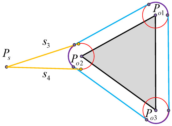 - The path from the start point and target point to the vertex of the obstacle. Because the starting and target points are the locations where USVs depart and arrive, the path from the start and target points to the obstacle vertex should be the tangent of the arc from the start and target points to the obstacle vertex. When the tangent point of the tangent falls on the safe arc corresponding to the vertex, the tangent is an optional path. When the USV moves toward the target point, if it needs to update the path, the path from the USV to the obstacle vertex needs to be recalculated because the USV has moved from the start point to a new position. The target point is always stationary, so there is no need to recalculate the path from the target point to the obstacle vertex.