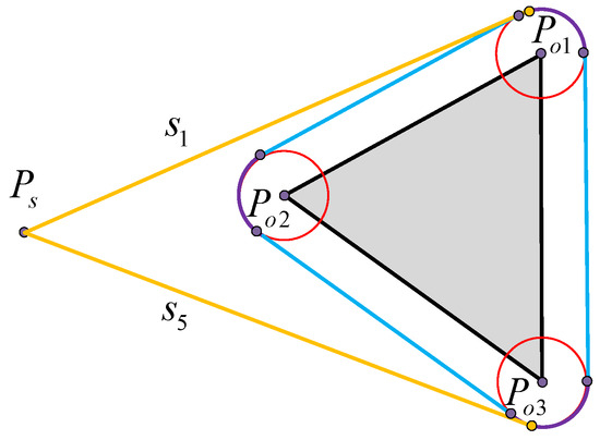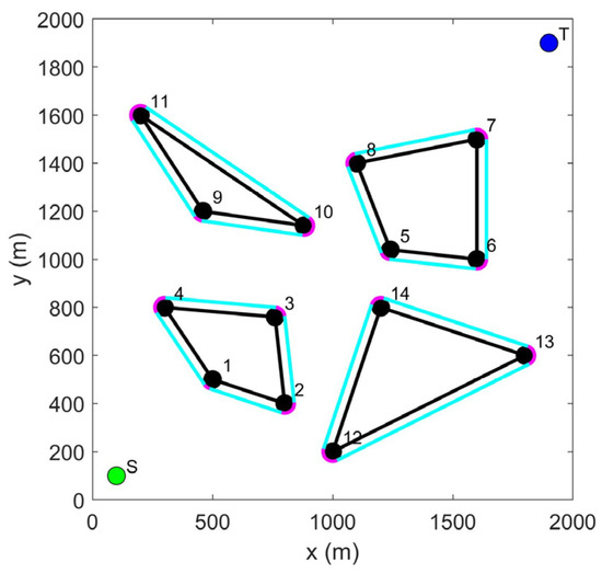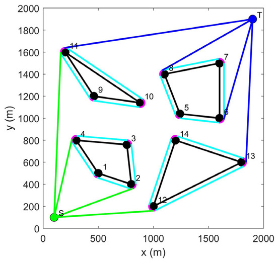 As shown in Figure 5, the arc is the safe boundary of the vertex , and the safe distance is . In the figure, the arcs , , and and lines , , and are the paths in LCPP.