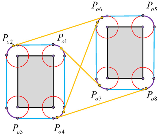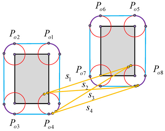 As shown in Figure 10, the blue line is the optional path extended by the obstacle edge, the purple arc is the safety arc extended by the obstacle vertex, and the yellow line is the four tangent lines between the corresponding safety circles of the vertex and . Only tangents with all tangent points on the safe arc are optional paths, so based on the positions of the eight tangent points corresponding to the four tangents, only route is an optional path. Two obstacles each have four vertices. If the vertices of the same obstacle are also judged, 28 calculations are required, and there is no need to use tangents to judge the vertices themselves. As shown in Figure 11, LCPP has four selectable paths between two obstacle vertices, while VG corresponds to six paths. In comparison, the improved selectable paths are safer and have fewer options, which is beneficial for reducing the filtering range in subsequent path selection.