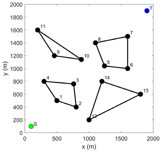 Since the Dijkstra algorithm calculates the weights (path lengths) from the start point to all nodes in the graph, it can calculate the shortest path from one start point to target points at a time. The path planning for multiple USVs in task planning is to plan the paths of USVs to target points, usually requiring planning paths. However, the Dijkstra algorithm only needs to be calculated times, and the computational complexity is , as shown in Figure 20 and Figure 21.