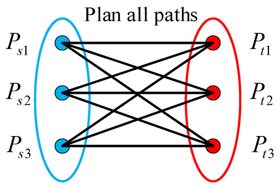 On a two-dimensional sea chart, the position of the USV can be represented by . represents the planned path from the start point to the target point , and is the path parameter, which can be either the length variable of a straight path or the angle variable of a curved path. The selection of path variables depends on whether the path is a straight line or a curve. is constrained by the motion constraint of the USV and safety constraint related to obstacles. The path planning for multiple USVs is from USVs at start points to target points, as shown in (1).