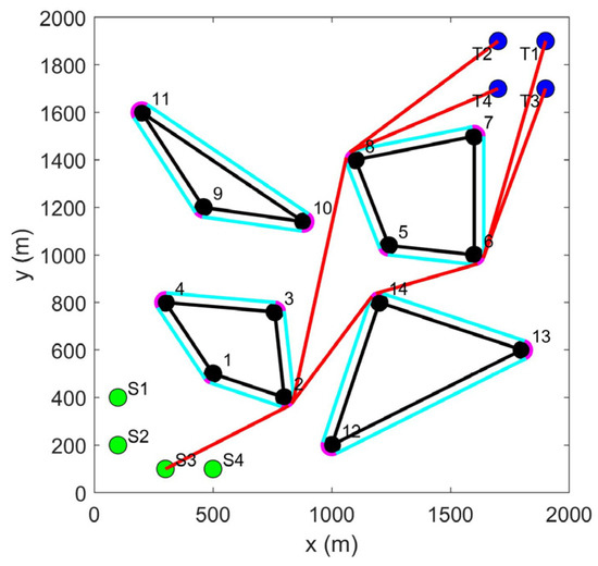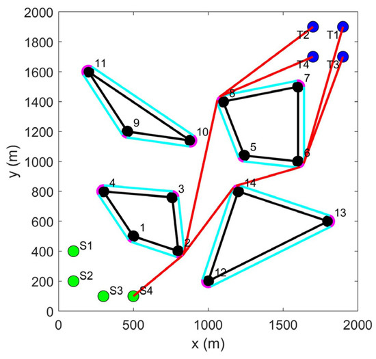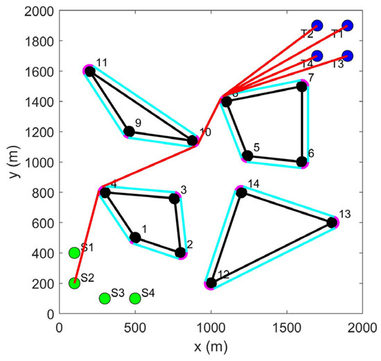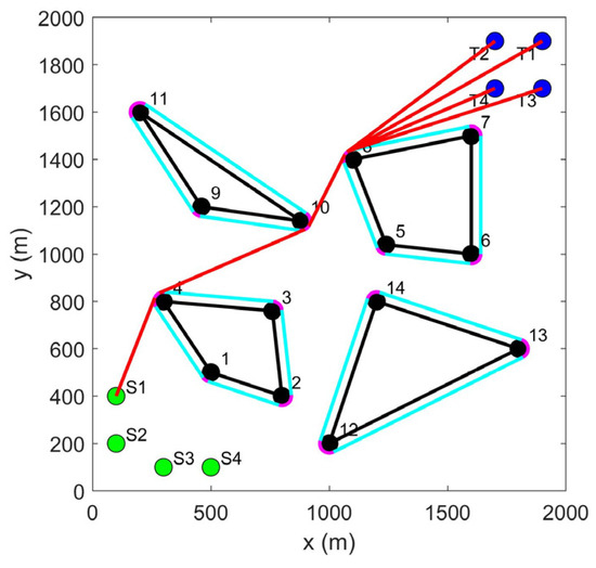 There are 16 paths from each starting point to each target point. The paths from the same starting point to all target points are calculated each time using the Dijkstra algorithm, as shown in Figure 22, Figure 23, Figure 24 and Figure 25.