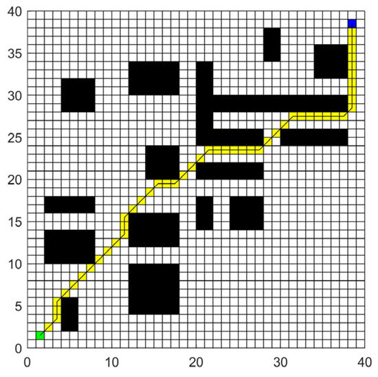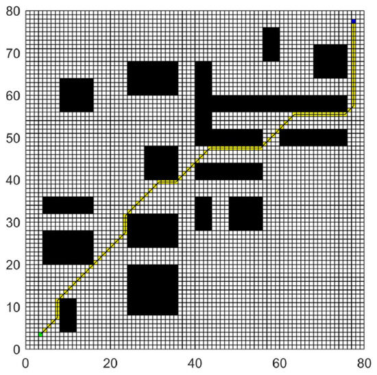 In other path-planning algorithms, the A * algorithm has lower calculation time and path distance values. The FMM plans a shorter path and constructs a potential field map covering the entire map, which takes a longer calculation time. The RRT has a longer calculation time and path length than the Bi-RRT and PRM. GA/GD and ACO have relatively longer calculation times and path lengths according to the population size and iteration times.