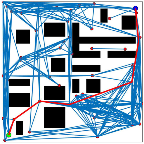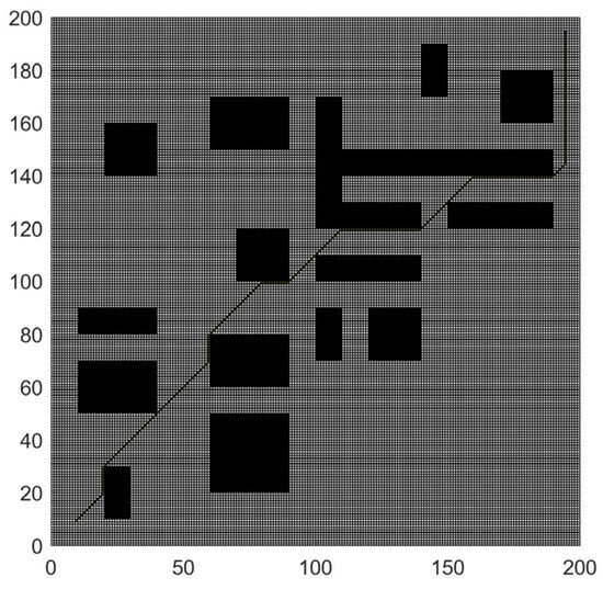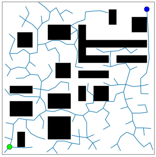 The visibility graph method (VG) takes the start point , target point , and vertices of polygonal obstacles as the vertices, connects these vertices to each other, and preserves the lines that do not cross obstacles as visible edges [21]. In Figure 4, the paths are planned from the start point to the target point using VG in an area with two obstacles. The gray rectangle represents obstacles and the blue line segment represents the planned path.