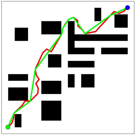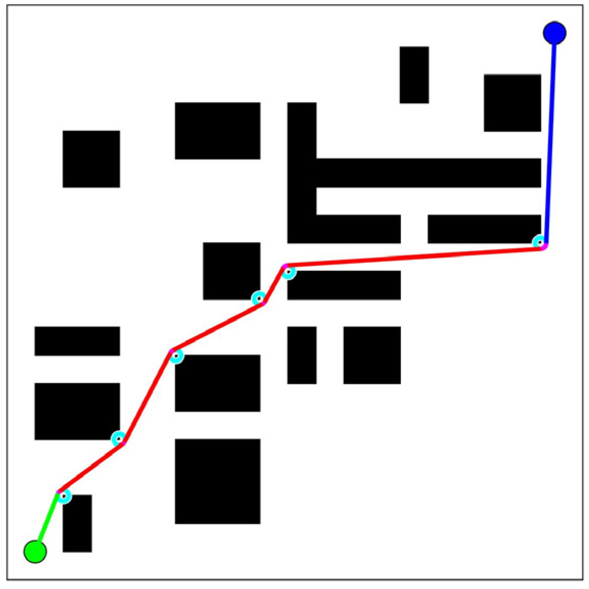 The initial environment for comparing LCPP and VG is shown in Figure 12. The calculation results of VG are shown in Figure 13, where the green lines represent the path from the start point to the vertex of the obstacle, with five lines. The blue lines represent the path from the target point to the vertex of the obstacle, with five lines. The red straight line is the path from the vertex of the obstacle to the vertex of the obstacle, with 39 lines.