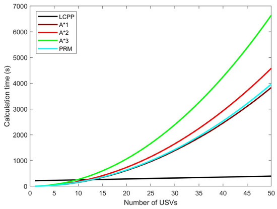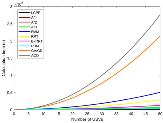 In the figure, the calculation time of LCPP increases linearly, and the path-planning complexity is only . The computation time of other algorithms increases exponentially, and their path planning complexity is . Although LCPP initially takes some time to construct the path between obstacles (static obstacles mean the path between obstacles is calculated only once), as the number of USVs increases (such as in Figure 46, where the number of USVs is greater than 14), the calculation time of LCPP will eventually be less than other algorithms.