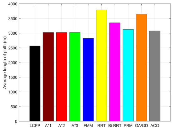 The average lengths of the paths planned by 10 algorithms are shown in Figure 47. LCPP has the shortest path length.
