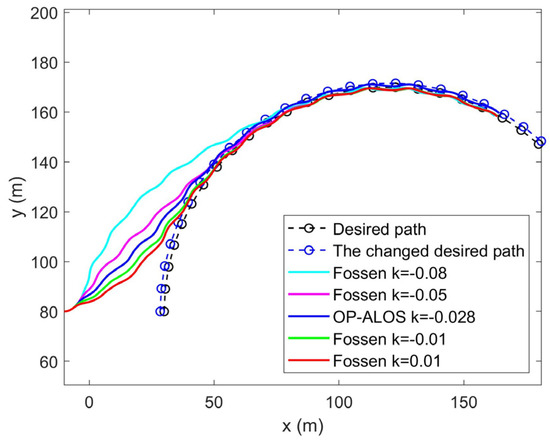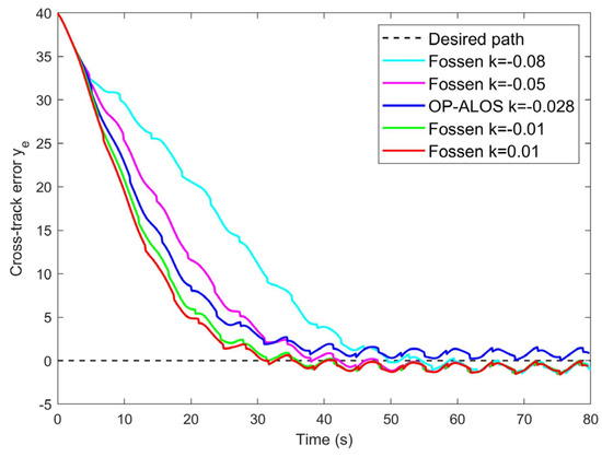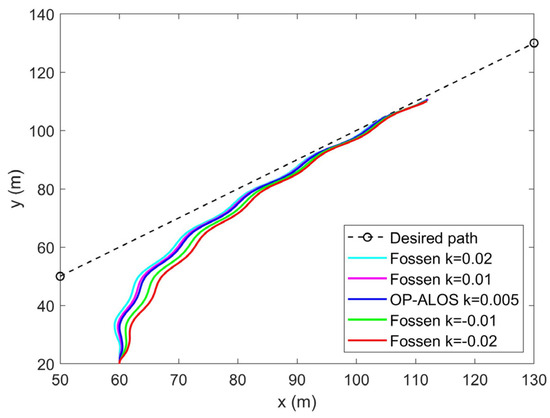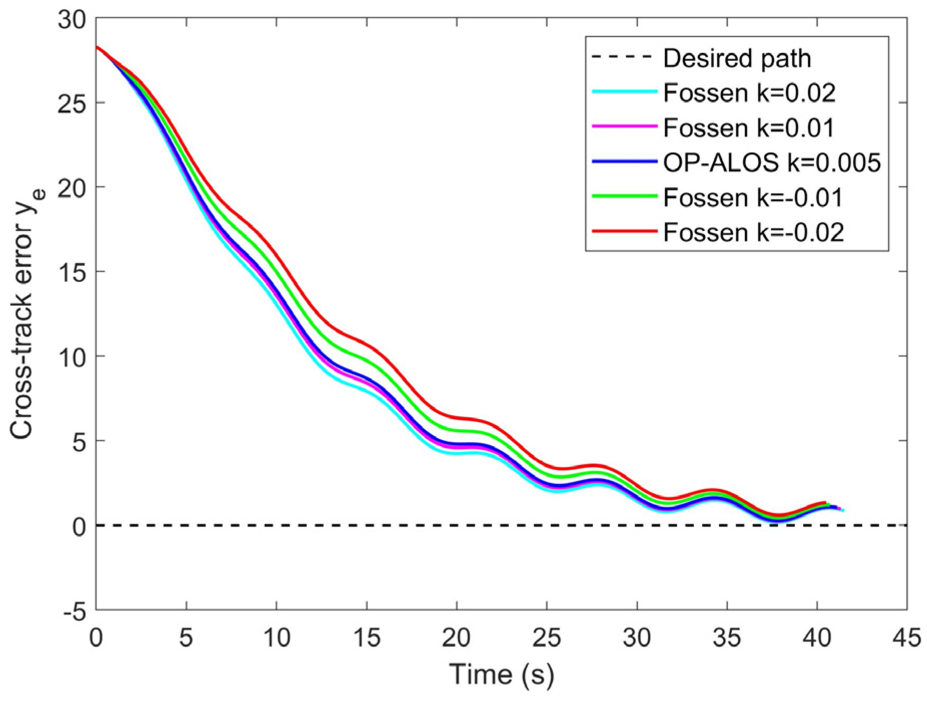 In the simulation of the straight desired path, the initial position is . The points of the desired path (DP) are and . We add the lateral time-varying disturbance velocity , where is the speed of the USV and is the simulation time. The comparison results between ALOS with the optimized parameter (OP-ALOS) and guidance algorithms of Fossen and Wan are shown in Figure 48, Figure 49, Figure 50 and Figure 51.