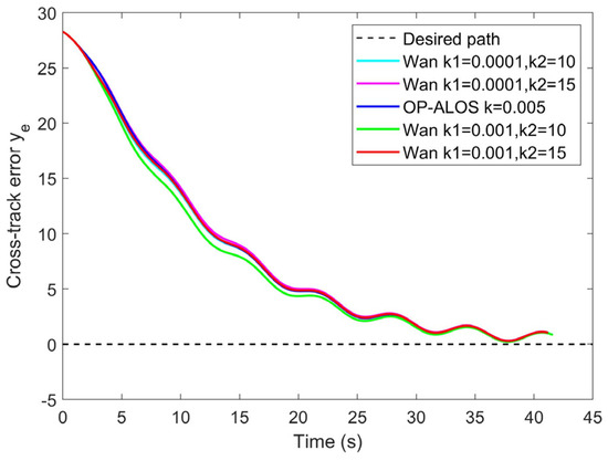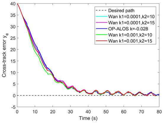 Due to significant time-varying disturbances, the cross-track errors of USVs have not remained stable, and the corresponding stability errors and convergence time are invalid. The maximum errors corresponding to the five trajectories of OP-ALOS and Fossen’s algorithm are 0.1659, 0.2349, 0.2757, 0.4392, and 0.6001, with relatively small differences. The maximum errors corresponding to the five trajectories of OP-ALOS and Wan’s algorithm are 0.2871, 0.3186, 0.2757, 0.2121, and 0.2966. All maximum errors are positive, indicating that the USV is always on the same side as the start point relative to the desired path. The maximum error of OP-ALOS is 0.2757, which is relatively small, proving its effectiveness in time-varying disturbances.