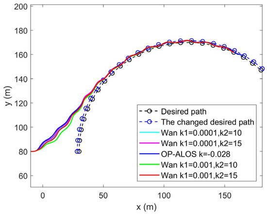 The initial speed of the USV is 1 m/s. In the LOS, and are set to 6 times and 3 times the length of the USV, respectively. The control algorithm for USV is PID, with the input of and the output of the rudder angle . The relevant parameters are , , and .