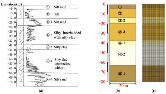 Model 1 is selected as a typical model for result analysis and discussion. Model 1 consists of four layers, and the soil types of each layer from the bottom of the model upwards are silt clay, silt sand, silt clay, and silt sand. The thicknesses of each layer are 33 m, 25.5 m, 17.5 m, and 4 m, respectively, as shown in Figure 7a.