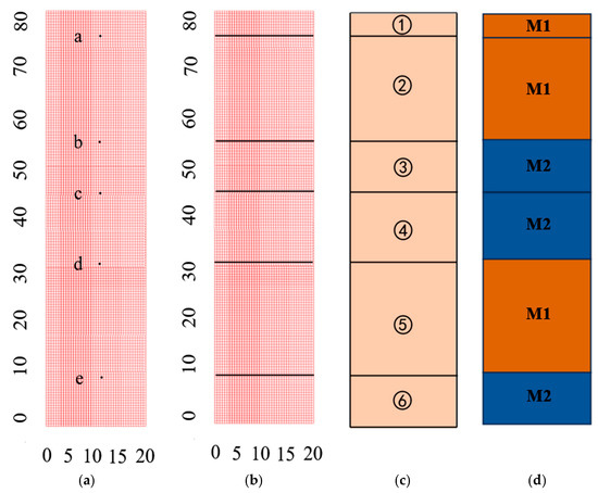 - The second randomization process is to randomly select n () layers of soil out of the 6 layers, whose material properties are set as clay layer (M1), and the remaining 6 n layers are set as sandy soil layers (M2). See Figure 2d.