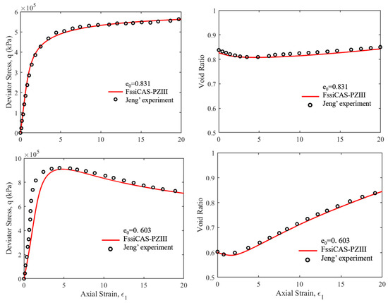 Many studies [34,35,36,37,38] have shown that marine clays are subject to stiffness degradation and shear modulus folding under complex stress states. The elasto-plastic dynamic constitutive model of soft clay developed by Feng et al. [39] based on the critical state and boundary surface theoretical framework was proposed to capture the mechanical behavior of submarine foundations of clay layers. In this study, Soft Clay model was developed and embedded in the finite element software FssiCAS V3.5.0, and the reliability of the Soft Clay model was verified by the isotropic compression test, isotropic compression–unloading-reloading test, triaxial drainage compression test, and undrained dynamic triaxial test. Numerical predictions from FssiCAS were validated against experimental data reported by Fei et al. [40], which are shown in Figure 4. A high degree of concordance is observed between FssiCAS simulations and experimental results, which indicates that the Soft Clay model has a high degree of reliability in describing the static and dynamic mechanical behavior of clay.