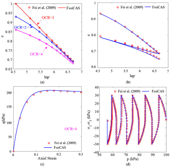 Comparison of numerical results provided by FssiCAS and Fei’s experimental results. (a) Isotropic compression test (initial stress of 100 kPa and isotropic compression stress ranging from 100 to 800 kPa). (b) Isotropic compression–unloading–reloading test (initial stress of 100 kPa, isotropic compression to 800 kPa, unloading to 100 kPa, and reloading to 800 kPa). (c) Triaxial consolidated drained compression test (confining pressure of 100 kPa and 30% strain along the z-direction, with uniform loading in 10,000 steps). (d) Undrained cyclic triaxial test (confining pressure of 100 kPa, sinusoidal cyclic load applied along the z-direction, dynamic stress amplitude of 30 kPa, frequency of 1 Hz, 5 cycles) [40].