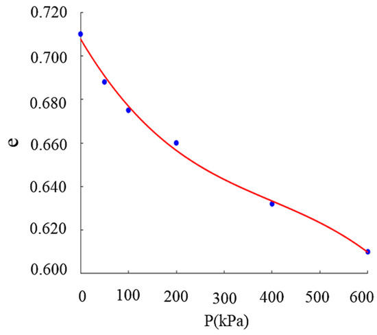 Zhao et al. [2] carried out a series of indoor dynamic triaxial and resonant column tests on field soil samples for soft clay and sandy soils in the southeast coastal region of China. Zhao et al. obtained the mechanical parameters of soft clay and sandy soil, as shown in Table 1. The e–p curve of sandy soil is shown in Figure 5.