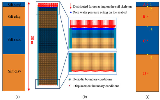 The boundary conditions implemented for Model 1 are shown in Figure 7b. The xz-directional displacements are fixed at the bottom of the model and the excited seismic wave is input at the bottom; the periodic boundaries are implemented laterally to minimize seismic wave reflection along the model edges; and a hydrodynamic boundary is applied at the top of the model, which includes the boundary condition of the distributed force acting on the soil skeleton and the boundary condition of the pore pressure acting on the pore fluid. Some monitoring points were selected within the model to assist in the analysis of the results, and the locations of the monitoring points are shown in Figure 7c. Monitoring points 1~4 are used to monitor the displacement and acceleration response of the seabed soil surface, and monitoring points A~D are arranged to capture the pore pressure dynamics and effective stress evolution in the seabed foundation. The coordinates of each monitoring point are A (10, 0, 78), B (10, 0, 67.25), C (10, 0, 45.75), D (10, 0, 16.5), 1 (10, 0, 80), 2 (10, 0, 76), 3 (10, 0, 58.5), and 4 (10, 0, 33), respectively.