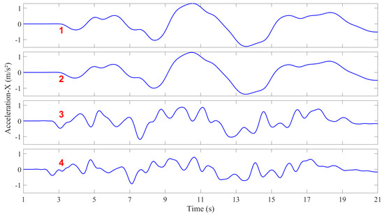 Acceleration time history at monitoring points during the seismic wave action (1–4 are monitoring points located at the top of each soil layer of the seabed foundation).