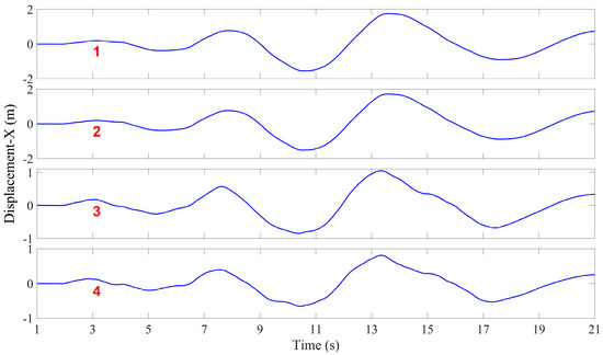 X-directional displacement time history at monitoring points during seismic wave action (Monitoring points 1–4 are positioned at the top of each soil layer of the seabed foundation).