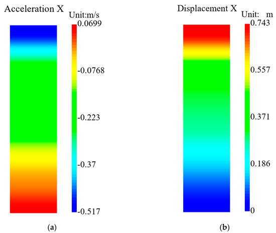 Acceleration and displacement distribution of seabed foundation at the typical moment (t = 21 s). (a) Acceleration along x-direction. (b) Displacement along the x-direction.