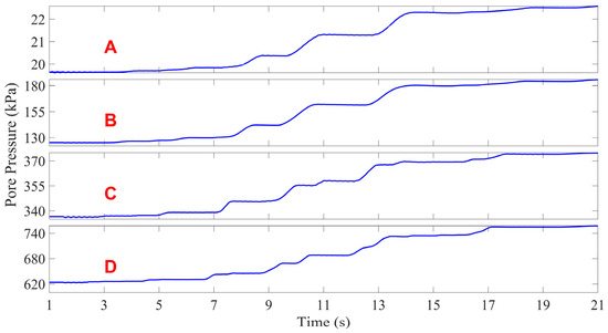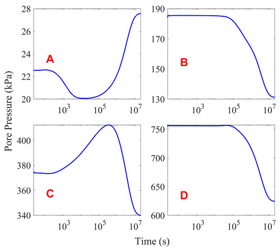 The variations in pore pressure at monitoring locations A–D throughout the post-seismic consolidation phase are illustrated in Figure 17. A, B, C, and D are located within four soil layers from top to bottom, where B and D are located in the clay layer and A and C are in the sand layer. Figure 17 shows that the pore water pressure continues to decrease at locations B and D until the excess pore pressure completely dissipates. For point A, the pore pressure first decreased and then increased significantly. At the end of consolidation, the pore pressure at point A increased by about 5 kPa compared with the initial value, which is an interesting phenomenon. It is known from the previous analyses that the shallow layer of the seabed subsided significantly during the post-earthquake consolidation stage, and the seabed surface subsided by about 0.8 m. Point A was located 2 m below the seabed surface, and the final settlement at point A at the end of the post-earthquake consolidation was about 0.6 m. Disregarding the change in the static water level, the depth of water at point A increased by 0.6 m after the post-earthquake consolidation. It can be concluded from these results that the increase in pore pressure at point A is due to the increase in hydrostatic pressure at this position.