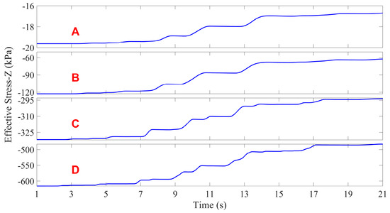 The z-direction effective stresses at the four monitoring points (A, B, C, and D) are shown in Figure 13. Within the 1–21 s seismic phase, the seabed effective stress exhibits monotonic reduction characteristics (the compressive stress is negative). The greater the burial depth of the soil layer, the greater the decrease in effective stress. It is certain that some degree of softening occurred in the seabed foundation. Since the model is a free-field seabed foundation with no structures present, the total stress can be assumed to be essentially constant for a point in the seabed soil. Then, the effective stress exhibits a monotonic reduction concomitant with pore pressure accumulation in the effective stress theory. The response patterns of pore pressure and effective stress shown in Figure 12 and Figure 13 coincide with this principle. The distribution of effective stresses in the seabed soil at the end of the seismic force is shown in Figure 14b, and the effective stress in the z-direction of the soil shows a clear stratified distribution.