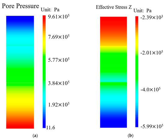 Pore pressure and z-directional effective stress distribution at the typical time (t = 21 s). (a) Pore pressure. (b) Effective stress along the z-direction.