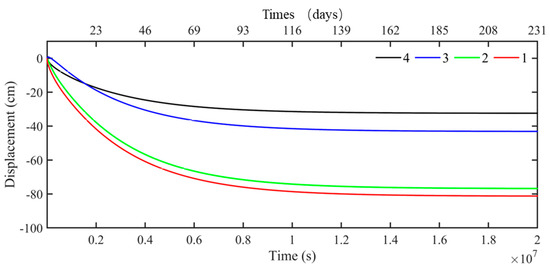 The time history of z-directional displacement response at the typical positions during the post-seismic consolidation process is shown in Figure 16. The horizontal axis at the top of the diagram is scaled in days, while the bottom axis uses seconds. It can be seen that, during the post-seismic consolidation phase, significant vertical settlement occurred in the seabed foundations; the amount of settlement decreased gradually with the depth of the soil layer; and the maximum settlement occurred on the surface of the seabed foundation soil, which was about 0.82 m.