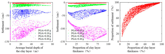 The seismic dynamic response characteristics of a typical case have been analyzed in detail. Next, the results of the 4000 cases are analyzed statistically. Figure 18 shows the relationship between seabed settlement and the average burial depth of the clay layer, the relationship between seabed settlement and the percentage of clay layer thickness, and the relationship between the percentage of the foundation settlement of the clay layer and the percentage of clay layer thickness. The average burial depth of the clay layer is defined as follows: