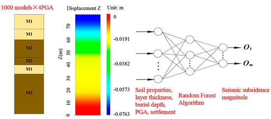 There are many algorithms that have been used to develop machine learning models such as the Random Forest algorithm, Gradient Ascent algorithm, XGBoost algorithm, and Linear Regression algorithm. Studies have shown that the Random Forest algorithm has good applicability and reliability in the foundation settlement prediction problem [42,43,44,45,46,47]. In this study, the Random Forest algorithm is selected to establish the prediction model. The establishment of the rapid prediction model for the seismic-induced subsidence of seabed foundations with interbedded soft clay–sand is illustrated in Figure 19.