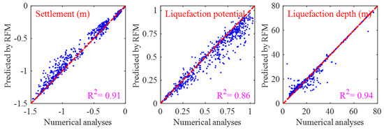 The prediction performance of the Random Forest model (RFM) is illustrated in Figure 20. As observed from the figure, the scatter points determined by the numerical simulation results and the prediction results provided by the rapid prediction model are uniformly distributed around the diagonal line (with a slope of one), which indicates that there is a highly linear relationship between the prediction results and the numerical simulation results. The rapid prediction model for the seismic-induced subsidence of seabed foundations with interbedded soft clay–sand, as developed in this study, shows commendable accuracy in the prediction of the settlement, liquefaction potential (L_potential), and liquefaction depth (L_depth), with an R2 value exceeding 0.86.