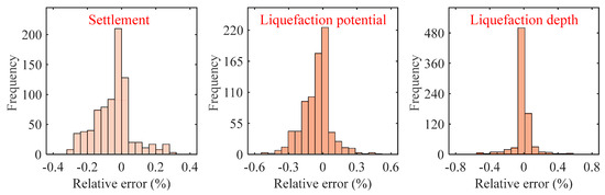 A histogram of prediction errors for the settlement, liquefaction potential (L_potential), and liquefaction depth (L_depth) is shown in Figure 21. The percentage error between the simulated and predicted values is plotted on the horizontal axis, with the frequency displayed on the vertical axis. It can be found that the prediction errors are primarily distributed within the range of ±0.6%. These results indicate that the Random Forest-based machine learning model can effectively predict the seismic settlement characteristics of foundations with interbedded soft clay–sand and its predictions have a high level of reliability.