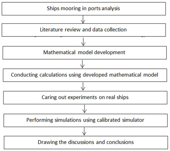 The following steps of the research methodology were used to conduct the study: analysis of ship berthing in ports under very limited space conditions; literature review and data collection; development of a mathematical model; performance of calculations using the developed mathematical model; performance of experiments on real ship berthing under very limited space conditions; use of a calibrated simulator to perform ship mooring under very limited space conditions; calibration of the mathematical model based on the results of the experiments; and discussion and drawing conclusions (Figure 3).