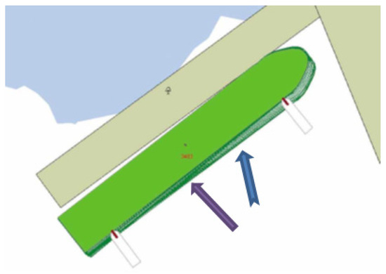 Traditional tugboat push/pull method used in ship berthing operations (blue arrow—current; purple arrow—wind) [34].