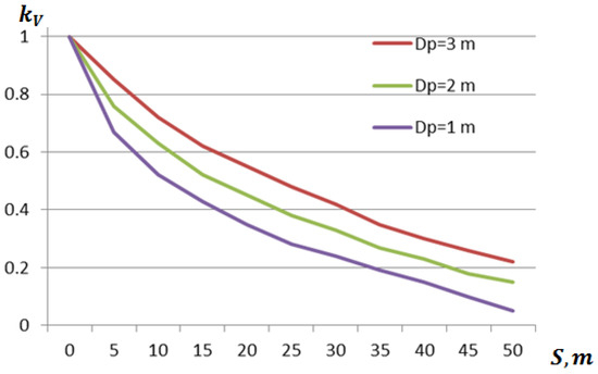 where —the coefficient of the induced jet speed depends on the diameter of the tug propeller and the distance (S) between the propeller and checking point (ship hull) and was received by conducting theoretical investigations and experimental tests on real tugs (Figure 6) [44].