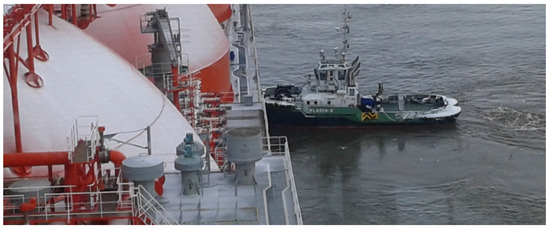 The traditional tugboat pulling/pushing method could be applied to many ship manoeuvring operations in port areas (Figure 4), as this method requires less water area. In particularly confined conditions, positioning the tugboat perpendicular to the ship is often not enough space and, in such cases, positioning the tugboat alongside the ship is possible (Figure 1 and Figure 2). In the push/pull method, the tug and the ship are coupled close together. In the case where the tug pushes the ship, the pushing force is equal to the calculated Formula (9). When towing a ship, two very important elements must be taken into account, i.e., the vertical angle of the tow line and the effect of the water flow created by the tug’s propeller on the ship’s side when pulling the ship away from the quay or holding it when approaching the quay.