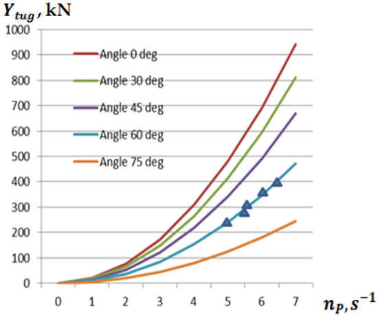 Depending on the towing rope angle, up to 90% load on the main engines of the tugboats, using the methodology developed in Chapter 3, is presented in Figure 8. Figure 8 presents the pulling force of two tugboats using the side towing method, depending on the angle of the towing lines between the tugboats and the towed vessel.