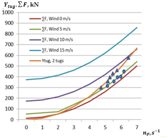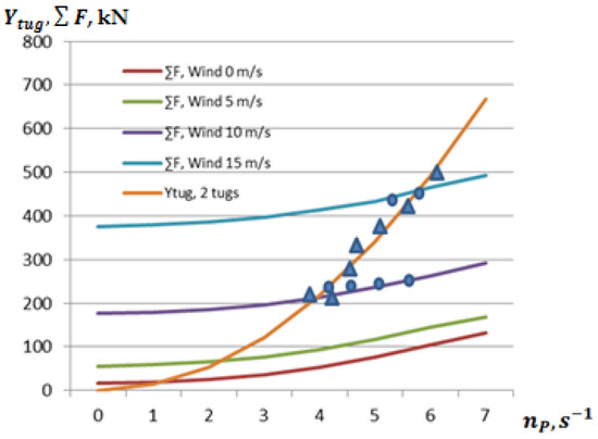 Forces created by the ship’s lateral resistance and 2 tugs using the “Push/pull” method, depending on the crosswind speed and the angle of the towline 45°, obtained theoretically (lines) and experimentally (triangles—tugs’ pulling force, circles—ship’s hull’s total resistance force).