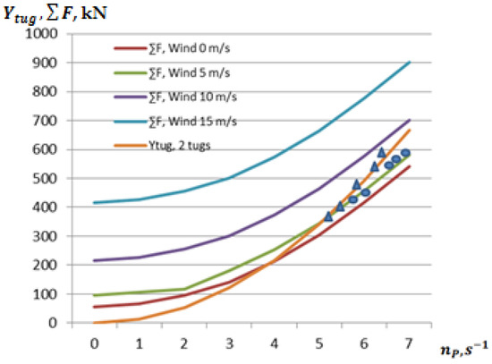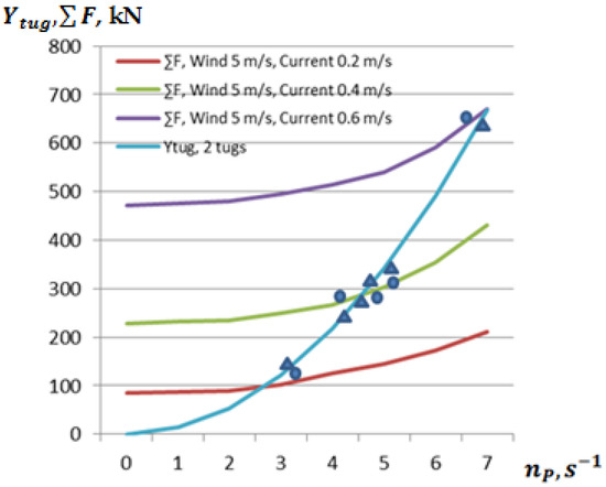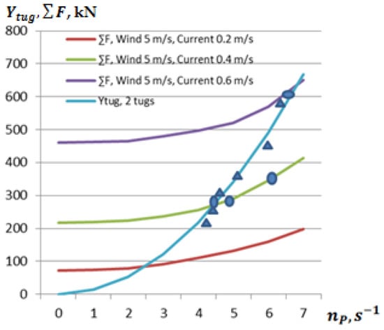 Ship towing capabilities using the side towing method and ship‘s lateraling speed is 0.1 m/s when the towing rope angle is 45°, obtained theoretically and experimentally (triangles—tugboat pulling force, circles—ship hull total drag force).