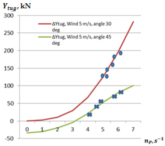 In this way, studies were conducted to obtain the difference between the pulling force of two tugboats and the lateral motion (resistance) force of the ship, at a lateral motion speed of the mooring ship of 0.05 m/s and 0.1 m/s, and with a wind direction towards the quay, the windspeed was about 5 m/s. The power of the tugboats used was about 85–90%, and the angle of the towing line was about 30° and 45°. The results of the studies are presented in Figure 14.