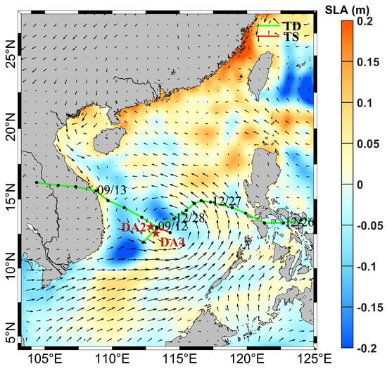 Data from the best-track data of tropical cyclones (TCs) from the Joint Typhoon Warning Center (JTWC) are available online at https://www.metoc.navy.mil/jtwc/jtwc.html (accessed on 10 February 2025). The CCMP wind products are available at https://www.remss.com/measurements/ccmp/ (accessed on 10 February 2025). The SLA and geostrophic current data from the CMEMS are available at https://data.marine.copernicus.eu/products (accessed on 10 February 2025). All figures in this paper were plotted in MATLAB R2022B.