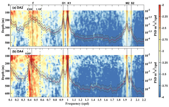 Log of PKE of currents at mooring (a) DA2 and (b) DA4 as a function of frequency and depth. Time series of the depth−averaged plot as a red solid line (0.1 cpd sliding), and the corresponding 95% confidence interval is represented by the gray shaded area.