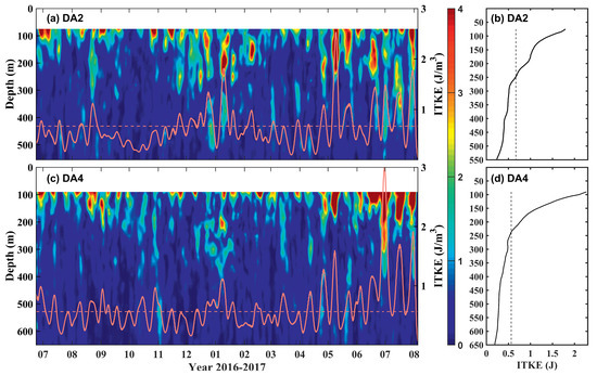 Depth–time plot of diurnal coherent KE () at (a) DA2 and (c) DA4. Depth–time plot of diurnal incoherent KE (J m−3) at (b) DA2 and (d) DA4. The purple solid line represents the time series of the depth-averaged diurnal KE from 100 to 500 m.