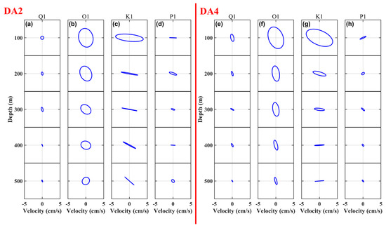 The vertical distribution of diurnal ITs’ ellipses for four major constituents (Q1, O1, K1, P1) of (a–d) DA2 and (e–h) DA4.
