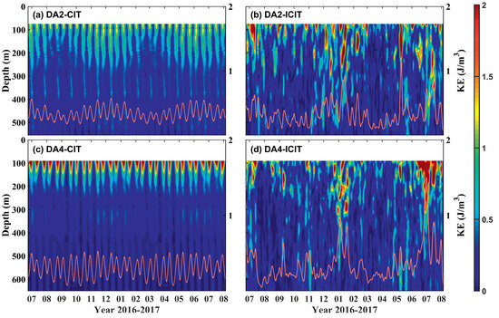 This section analyses the spatial and temporal distributions of diurnal ITs. Based on ADCP observations and using an average seawater density of 1024 , the depth and time-averaged horizontal kinetic energy (KE) of diurnal ITs is calculated as 0.56 (0.67 ) for DA2 (DA4). As shown in Figure 4, the time-varying characteristics of diurnal KE at the two moorings are synchronized, displaying a clear cycle of spring–neap oscillations with a period of approximately 14 days, which is primarily caused by the interfering effect of the K1 and O1 ITs. Additionally, the diurnal KE at both moorings is enhanced during May to July 2016 and December 2016 to February 2017, exhibiting a semiannual modulation due to the interference of K1 and P1 internal tides. The strongest diurnal KE during the observation period occurred around 10 May 2017 for DA2 and early July 2017 for DA4. In terms of vertical distribution, the KE at both sites is primarily concentrated at depths shallower than 250 m, with a rapid decrease below this depth, indicating the dominance of low-mode ITs propagating from the far field. The similarity in the spatial and temporal distributions of diurnal KE at the two moorings suggests that they may originate from the same generation site.