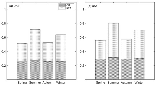 The seasonal average results of diurnal KE (J m−3) at (a) DA2 and (b) DA4 are shown, with grid-patterned shading representing coherent ITs, and dot-patterned shading representing incoherent ITs.