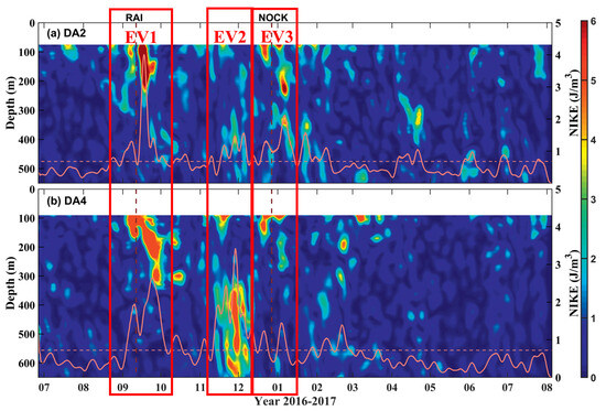Figure 8 shows the depth–time distribution of near-inertial KE during the observation period at moorings DA2 and DA4, the purple horizontal dashed line indicates the average value of this time series, and the brown dotted line indicates the latest time from RAI and NOCK to the station. Near-inertial KE exhibits strong temporal intermittency, with concentrations from September 2016 to March 2017, aligning with the timing of tropical cyclones in the SCS. During the passage of two TCs, intense NIWs are generated at the two mooring sites. However, due to the differences in the characteristics of the TCs, distances between TC centers and the moorings, and local conditions, the characteristics of NIWs at the two moorings also vary, which will be discussed in detail later. In addition to the TC-induced NIWs, though no TCs were reported close to the mooring sites, an unexpected NIW burst event was observed between November and December 2016. In this study, the near-inertial events induced by RAI and NOCK are referred to as event 1 (1 September to 6 October) and event 3 (15 December to 15 January), respectively. The NIW burst event observed from November to December is referred to as event 2 (5 November to 15 December).